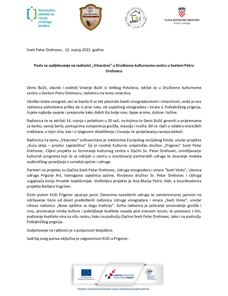 Poziv za sudjelovanje na radionici „Vinarstvo“ u Društveno kulturnome centru u Svetom Petru Orehovcu Objavljeno 12 srpnja, 202110 rujna, 2021 od admin