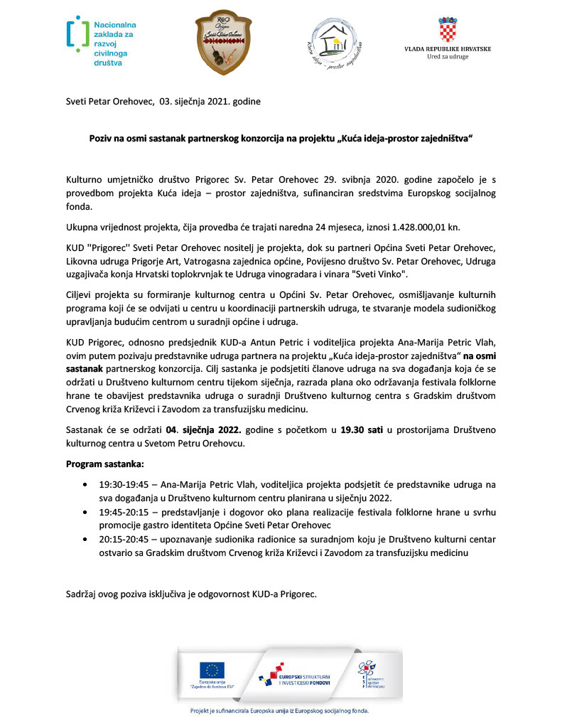 Poziv na osmi sastanak partnerskog konzorcija na projektu „Kuća ideja-prostor zajedništva“ Objavljeno 3 siječnja, 202221 listopada, 2025 od admin