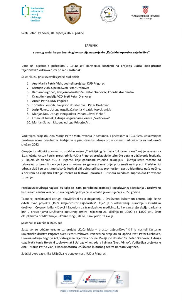 ZAPISNIK s osmog sastanka partnerskog konzorcija na projektu „Kuća ideja-prostor zajedništva“ Objavljeno 4 siječnja, 202221 listopada, 2025 od admin